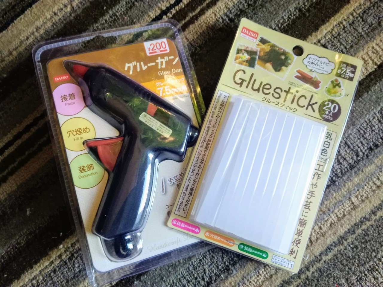 ヘアアクセを作るのにseriaに行ったら売ってなかった。DAISOに行ったらありましたよ〜。グルー"ガン"というだけあって鉄砲みたいな形してますね。別売りのグルースティックを後ろから差し込んでコンセントにつなぎ、熱っされるまでしばし待ちます。※スイッチとかはないので ...