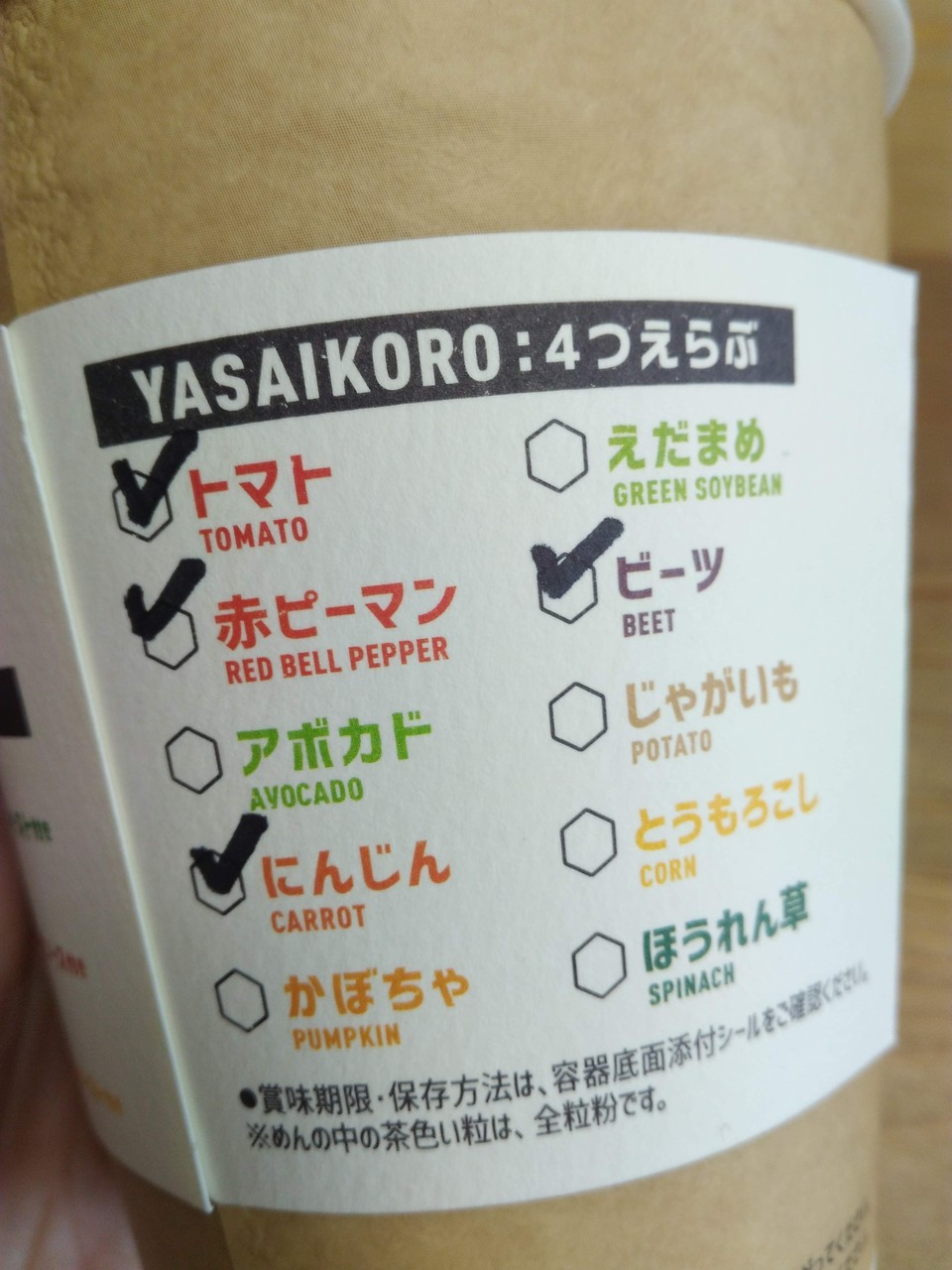 選んだヤサイコロ(具材)はパッケージにチェックしてあります。